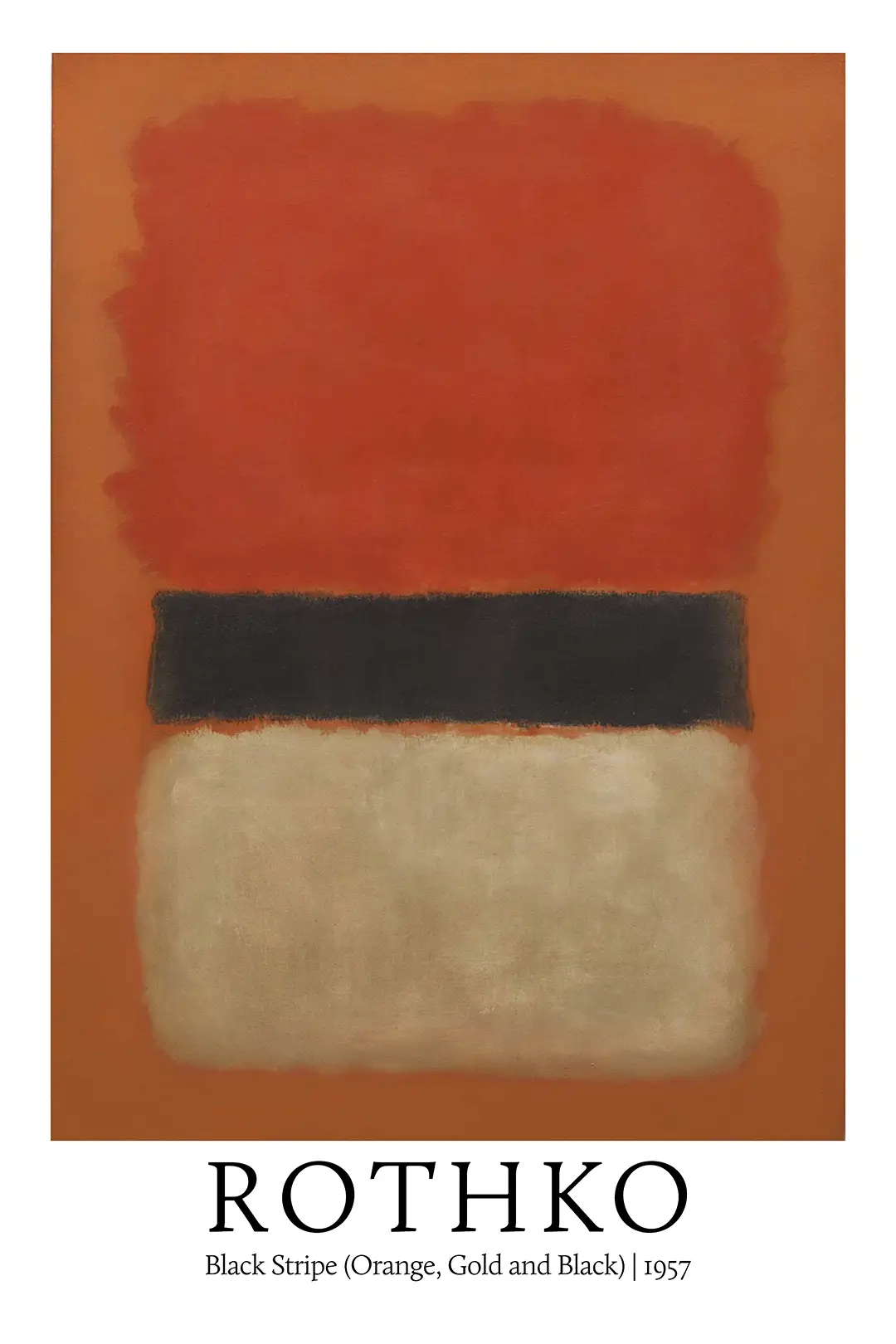 This Rothko exhibition poster presents the 1957 work titled Black Stripe (Orange, Gold and Black), a definitive example of the American Abstract Expressionist movement. During this period, the artist moved toward larger scales and simplified geometric forms to evoke visceral emotional responses through pure color saturation. This specific reproduction captures the feathered edges and layered glazes that define the mid-century modern aesthetic, providing a sophisticated visual anchor for any residential or professional gallery space.