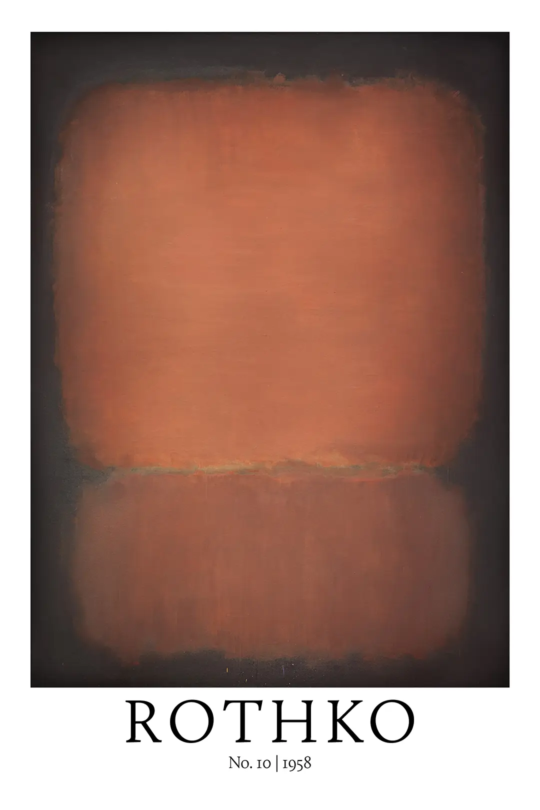 Rothko No 10 1958 is a defining representation of the Abstract Expressionist movement’s focus on color and form. Produced during a pivotal period in the artist’s career, this specific composition illustrates the transition toward the darker, more somber palettes that characterized his later work. The imagery consists of two primary rectangular fields that appear to hover within a dark, nebulous perimeter. The upper section is rendered in a saturated, earthy orange-red, while the lower section presents a desaturated, shadowy brown. These forms are not rigid; their edges are feathered and blurred, allowing the colors to bleed into the surrounding black tones, creating a sense of depth and atmospheric vibration.
