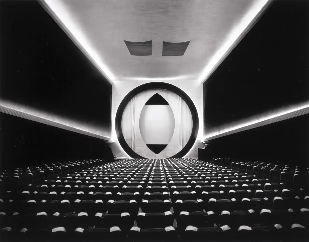 Capture the dramatic symmetry and atmospheric geometry of early 20th-century design with this stunning black and white photography poster by Ruth Bernhard. This iconic image, featuring the empty interior of a grand Art Deco or Streamline Moderne cinema, highlights the spectacular use of light, shadow, and repeating patterns. The visual focus is drawn to the circular stage opening and the meticulous rows of empty seating, creating a powerful sense of anticipation and minimalist elegance. This piece is a perfect statement for fans of mid-century design, architectural history, and classic fine art prints.