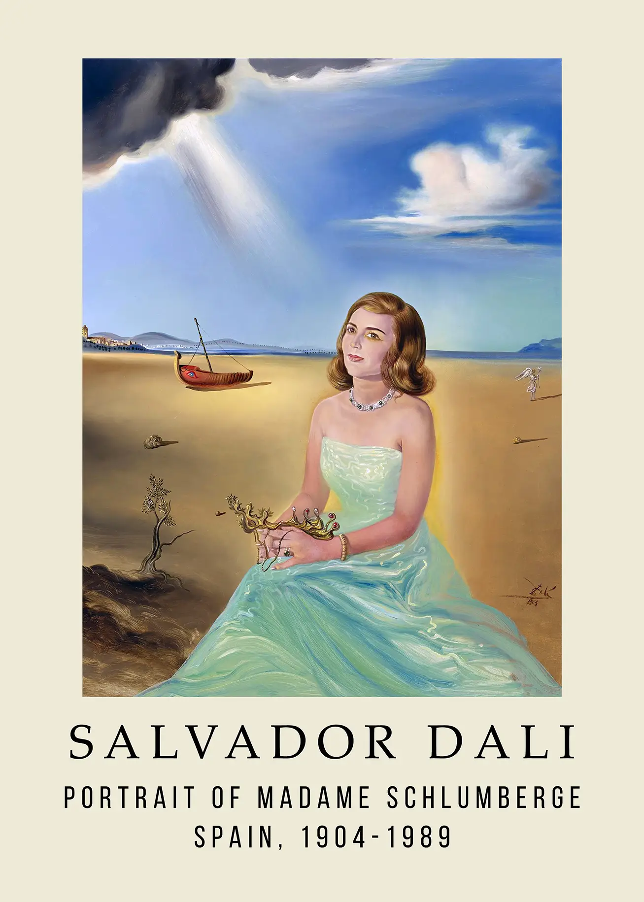 The visual narrative featured in this Salvador Dali Art Print is heavy with symbolic weight. Madame Schlumberge holds a delicate, jewel-encrusted crown between her hands, a gesture that suggests both the weight of status and the fragility of beauty. To her left, a gnarled, leafless tree rises from the sand, contrasting with the fluid motion of her gown. In the distance, a traditional Mediterranean boat, or llaüt, sits on the shore, its prow painted with a protective eye, a recurring motif in the artist’s regional works. The play of light is particularly technical; a solid beam of illumination descends from a dark, heavy cloud in the upper left, casting a sharp glow upon the scene and highlighting the Madame Schlumberge surrealist painting style.