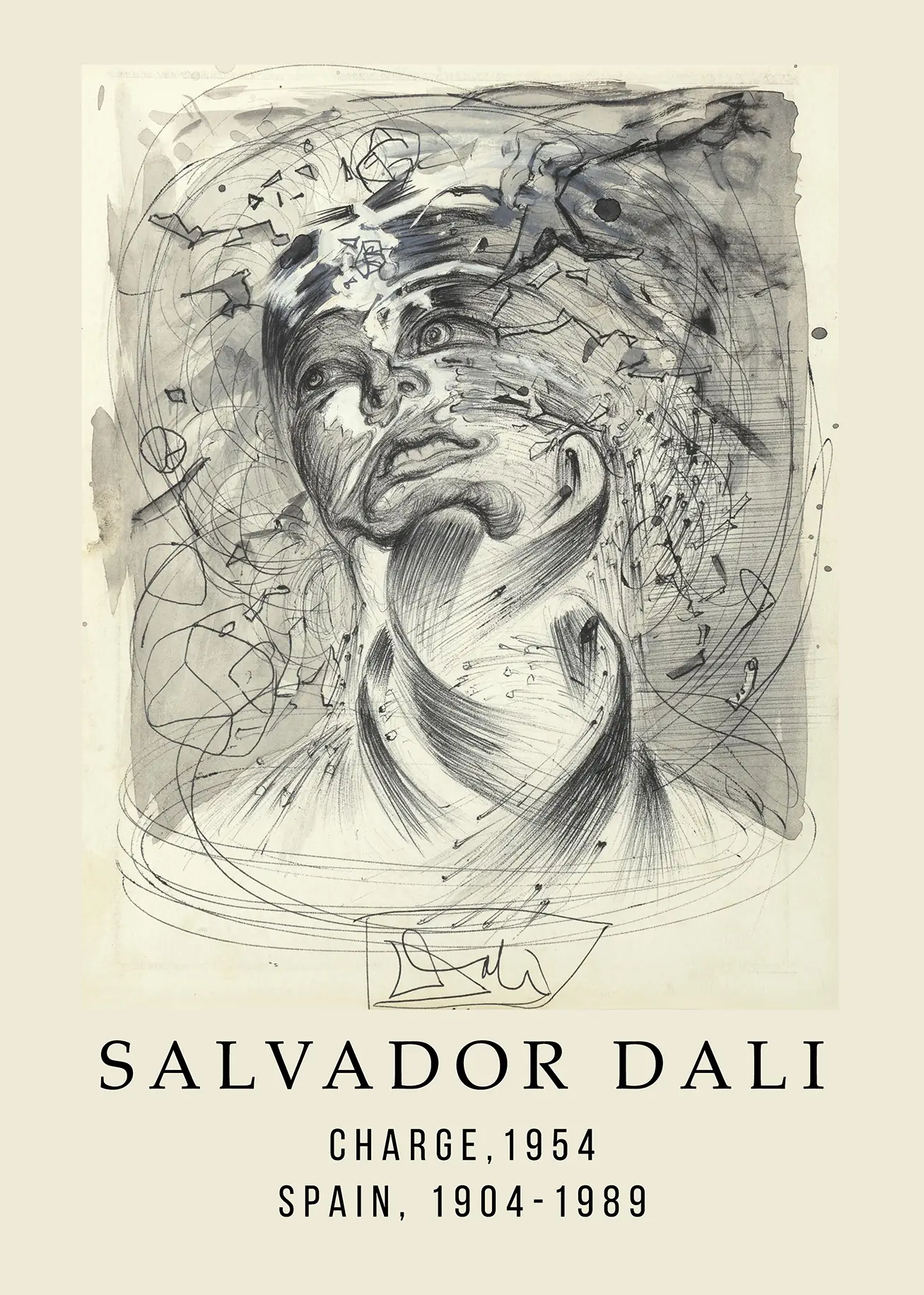 The 1950s were a pivotal decade for the artist as he integrated Catholic theology with nuclear physics. The Salvador Dali Charge 1954 artwork exemplifies this era, often referred to as Atomic Mysticism. The swirling vortex of lines around the head serves as a halo or an electron cloud, representing the invisible forces that govern the universe. This particular museum quality poster provides a sophisticated focal point for interiors that prioritize intellectual depth and historical context. The minimalist cream background ensures the complex linework remains the central focus of the viewer, making it suitable for modern office spaces, academic studies, or formal living rooms.