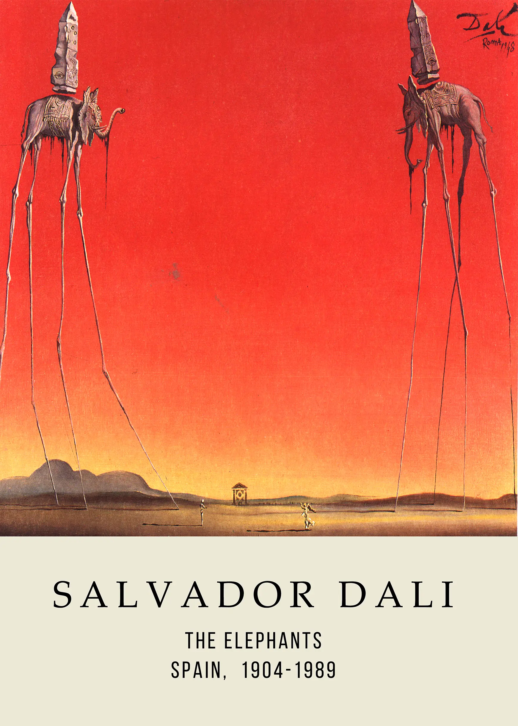 The Salvador Dali Elephants print showcases the iconic spindly-legged figures under a saturated red sky. This surrealist art poster is printed with archival inks on museum-grade paper for lasting clarity.