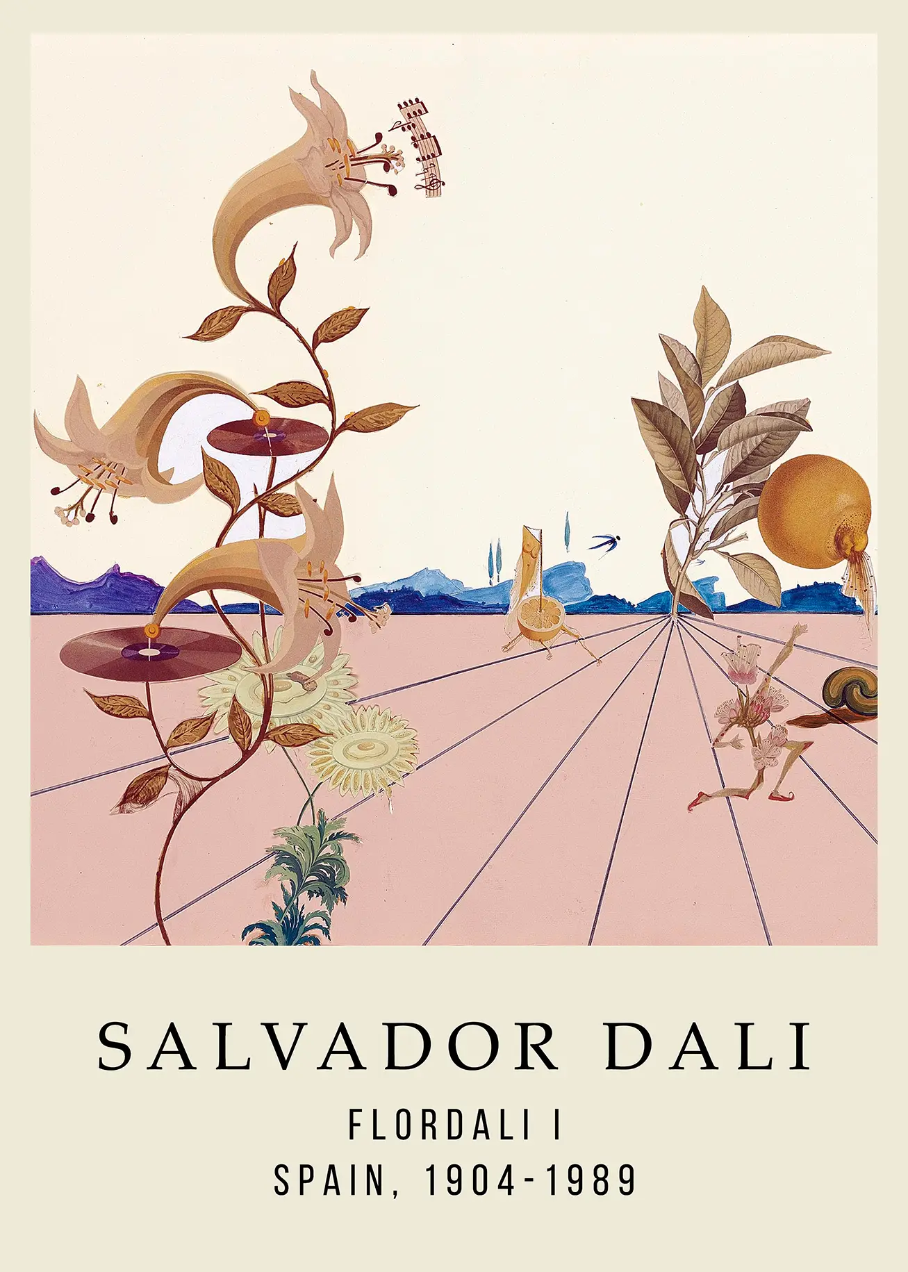 Set against a bi-tonal background of cream and dusty rose, the Salvador Dali Flordali I print utilizes sharp perspective lines that converge at a single point on the horizon, a hallmark of the artist’s structural technique. The middle ground contains a peculiar lemon-like figure on stilts and a small, floral-headed character performing a kinetic gesture across the desert floor. In the distance, jagged blue mountains provide a cool contrast to the warmth of the foreground sand. The botanical elements are rendered with scientific precision, yet their arrangement defies biological reality, creating a tension that defines the surrealist genre.