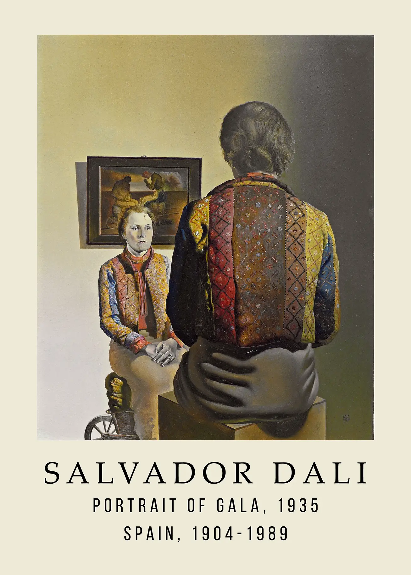 The Salvador Dali Gala print is a definitive example of the artist’s mid-1930s technical precision and his psychological obsession with his muse. Painted in 1935, this work captures Gala seated with her back toward the observer, a composition that forces the eye to focus on the tactile quality of her embroidered jacket before discovering her face in the reflection. This specific Salvador Dali Gala print showcases the transition from his earlier explosive surrealism into a more structured, classical approach that still maintains an unsettling, dreamlike atmosphere.