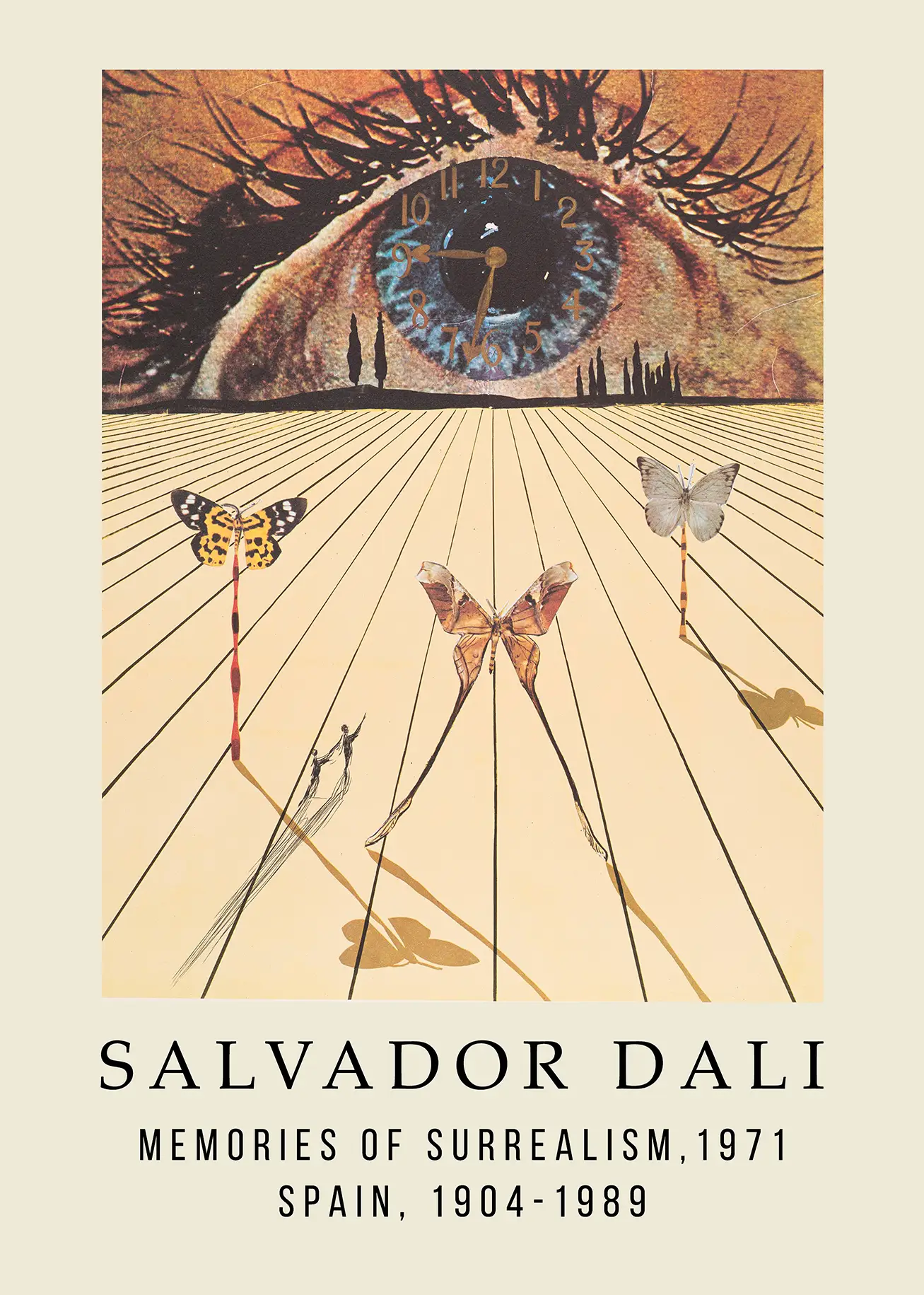 This Salvador Dali poster showcases the 1971 Memories of Surrealism artwork with its iconic clock eye and butterfly motifs. Every surrealist wall art print is produced on museum-grade matte paper.