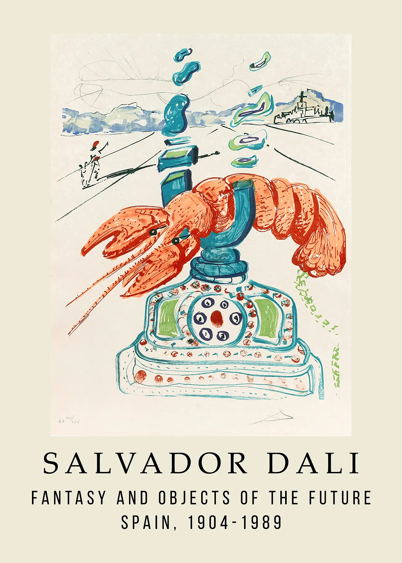This Salvador Dalí print serves as a definitive example of mid-century surrealist thought, capturing the eccentricities of one of the twentieth century’s most influential artists. Titled ‘Fantasy and Objects of the Future,’ this work highlights the famous lobster telephone, a recurring motif in the artist’s exploration of the subconscious mind. The composition juxtaposes a mechanical rotary telephone with a vivid, detailed lobster resting where the receiver should be, challenging the viewer to find meaning in the absurd. This specific Salvador Dalí print is reproduced with high fidelity, ensuring that every graphite-like line and watercolor wash from the original sketch remains visible to the naked eye.