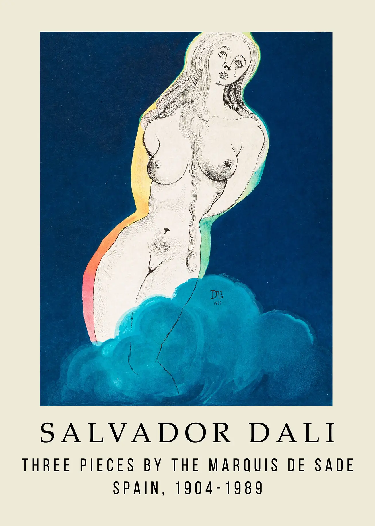 This Salvador Dali Sade print showcases a 1967 surrealist illustration of a crying female figure within a rainbow halo. This Marquis de Sade illustration is reproduced on 200 GSM museum-grade matte paper for lasting quality.