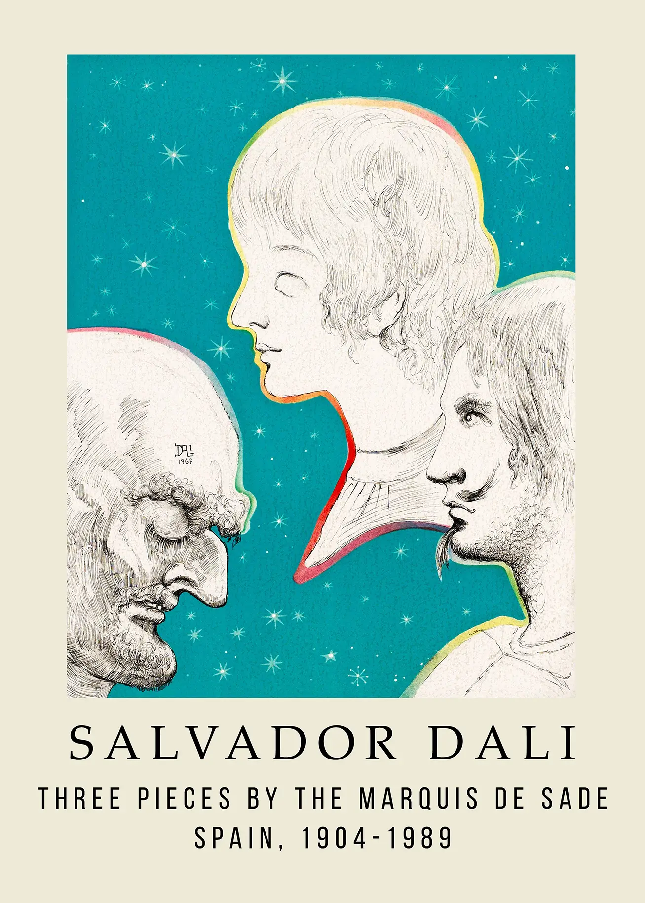 The Dali 1967 art poster series remains a significant entry in the history of literary illustration. Dali was known for his ability to translate complex psychological states into visual symbols, and these three profiles are no exception. The star-filled sky in the background suggests a cosmic or dream-like setting, detaching the figures from a specific time or place. We offer this Salvador Dali Sade Print in multiple sizes to accommodate different spatial requirements, from small accent pieces to large-scale wall features. The high-resolution 300 DPI PDF/JPG option ensures that even at larger scales, the fine lines of the original sketch remain crisp and defined. The enduring appeal of the Salvador Dali Sade Print lies in its balance of simplicity and complexity, representing a historical document of a collaboration between a legendary artist and the provocative legacy of a controversial writer.