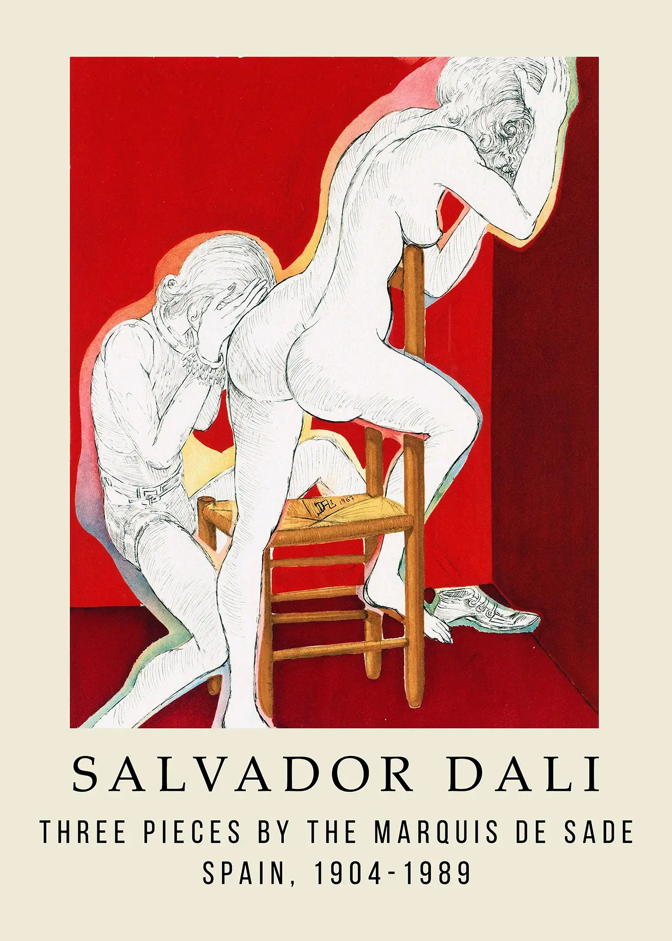 The Salvador Dali Sade print is a provocative exploration of the human form and surrealist ideology, originally created for a 1967 publication of the Marquis de Sade’s writings. This specific piece demonstrates Dali’s ability to blend skeletal precision with fluid, dreamlike motion. The composition features two figures interacting with a simple wooden chair, set against a deep crimson background that suggests a claustrophobic yet theatrical space. The use of fine line work paired with soft color washes highlights the anatomical focus that Dali maintained throughout his career.