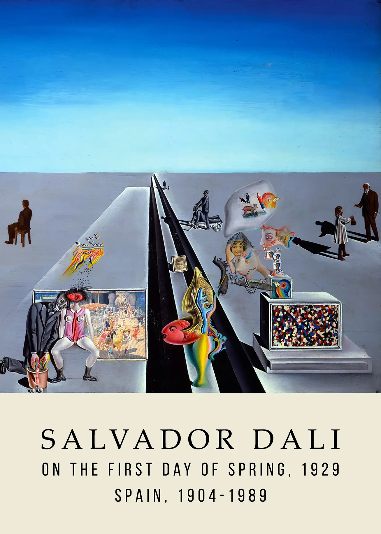 1929 was a transformative year for Spanish art, and the Salvador Dali Spring print captures the exact moment the movement began to influence global visual culture. During this period, Dalí was collaborating with figures like Luis Buñuel, and his paintings became more focused on childhood memories and Freudian symbols. In this specific image, the interaction between the small child and the older man on the far right suggests themes of inheritance, paternal influence, and the passage of time. The fragmented nature of the scenes represents the disjointed experience of dreaming, where logic is replaced by emotional and symbolic weight.