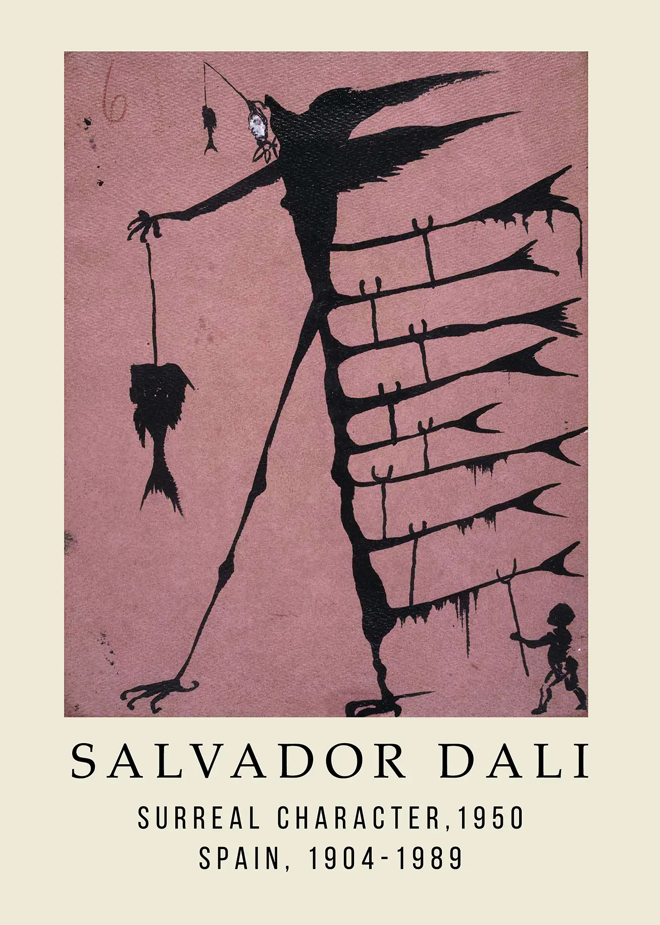 The visual narrative of this 1950 surrealist sketch is layered with symbolic elements typical of the Catalonian master. In the entity’s left hand—or what serves as its primary appendage—hangs a limp, skeletal fish, a recurring motif in Dali’s work representing the fluidity of time and the decay of organic forms. To the right, the creature’s body extends into multiple horizontal limbs that terminate in fork-like points or fin shapes, creating a rhythmic, almost mechanical repetition across the frame. These graphic elements make Salvador Dali surreal art highly compatible with minimalist or industrial interior designs that value strong geometry and monochromatic contrasts. The top left corner features a handwritten ‘6’, likely an archival notation from the original folio, adding an extra layer of historical texture to this vintage Spanish wall decor.