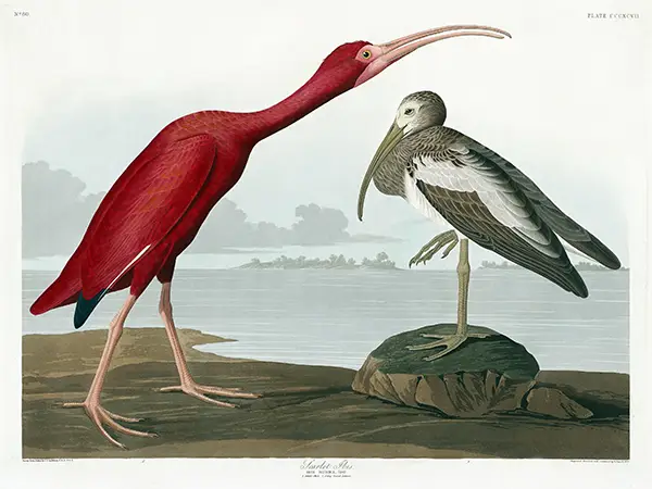 This historical Scarlet Ibis print captures the vivid intensity of one of nature’s most colorful avian species as documented by John James Audubon. Originally part of the seminal Birds of America collection, this illustration is widely recognized for its scientific accuracy and artistic boldness. The adult ibis is depicted with a striking carmine plumage that dominates the frame, showcasing the bird’s elongated, decurved bill and elegant neck. Its legs are rendered with anatomical precision, reflecting the naturalist’s dedication to physical realism and field observation. Beside the adult stands a juvenile specimen, providing a stark visual contrast with its mottled grey, brown, and white feathers, which is a detail often missed in lesser reproductions of this specific work.
