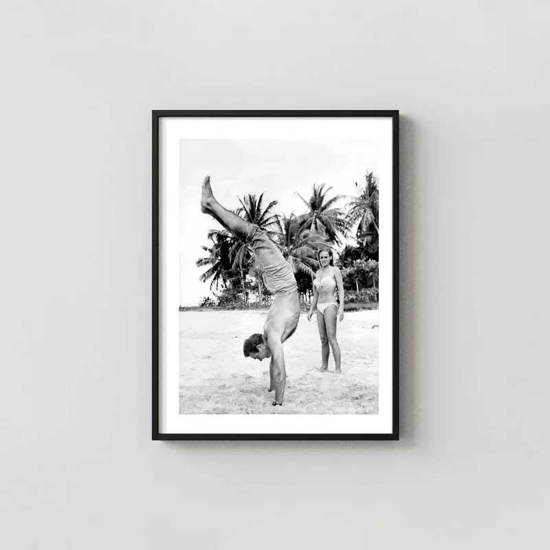 The beach context is important. It connects the image to the specific visual history of early Bond — the moment Ursula Andress walked out of the sea in Dr. No in 1962 and established the visual grammar of the franchise for the next six decades, with Connery watching from the sand in a way that made clear who was actually in charge of the scene. This Sean Connery black and white wall art belongs to that same visual chapter: the Bond era when everything felt genuinely sun-bleached and outdoor, before the franchise moved into gadgetry and soundstage sophistication. The beach photograph is the original Bond image — and Connery in it is the original Bond.