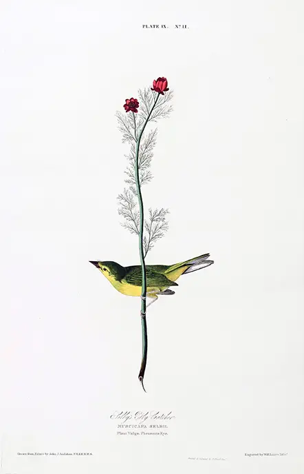 Prideux John Selby was a contemporary of John James Audubon, and a Selby bird print is often regarded as the British equivalent to the American Birds of America. Unlike many illustrators of the early 19th century who worked from taxidermy specimens, Selby was known for observing birds in their natural habitats. This commitment to realism is evident in the Muscicapa selbii plate. The bird is shown in a characteristic perching stance, its beak slightly parted and its eye rendered with a bead-like clarity that suggests a living subject. The composition avoids the stiff, heraldic poses common in earlier eras, opting instead for a dynamic botanical interaction.
