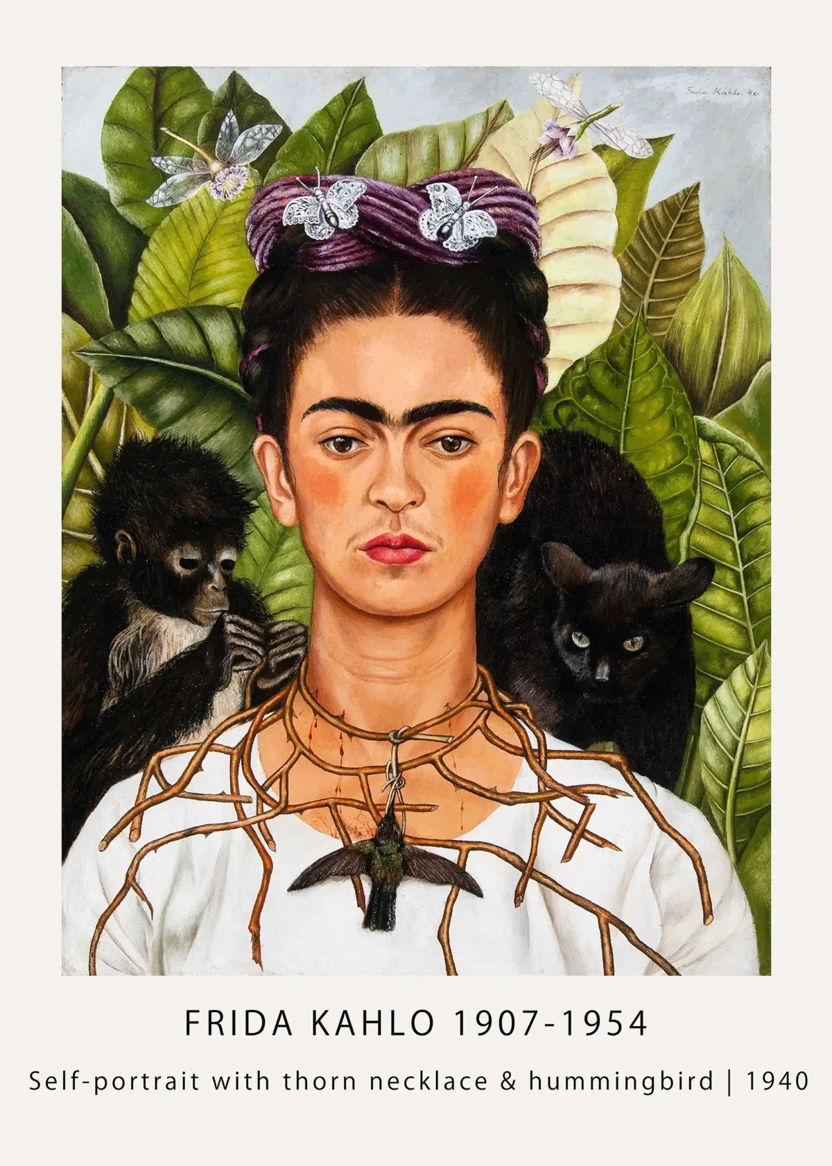 This frida kahlo thorn necklace poster features her most famous self-portrait from 1940. The self portrait with hummingbird print shows thorns piercing her neck, with a dead hummingbird pendant and watchful animals. Iconic 1940 kahlo iconic art symbolizing pain, death, and resilience.
