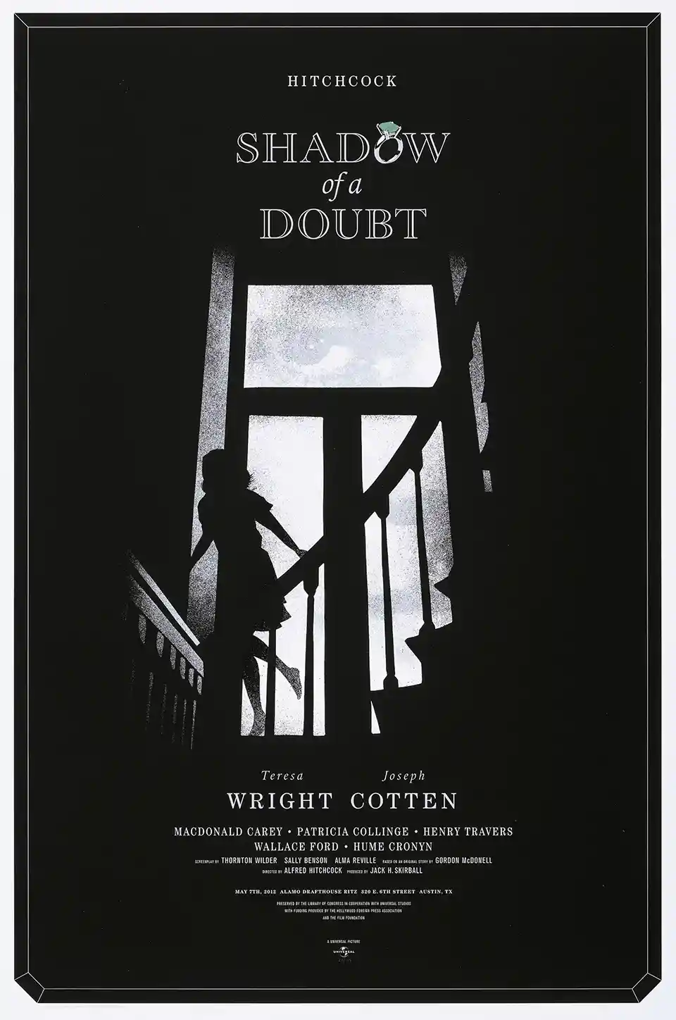 Own this stunning Shadow of a Doubt poster by Alan Hynes (Mondo 2012). A high-contrast tribute to the Alfred Hitchcock classic starring Teresa Wright. Perfect for film noir fans.