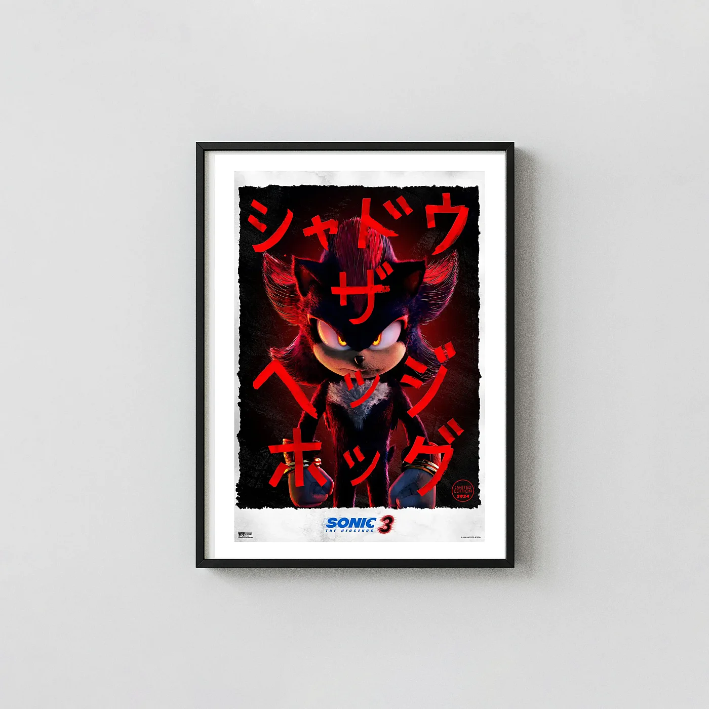 Capture the intensity of Shadow the Hedgehog’s cinematic debut with this stunning official movie poster for Sonic the Hedgehog 3. This premium wall art features a powerful, close-up portrait of the Ultimate Life Form against a brooding black and red background, perfectly capturing his dark and complex nature. The design is elevated by striking red Japanese Katakana text overlaid on the image, providing a unique, stylized aesthetic that honors the character’s SEGA roots.
