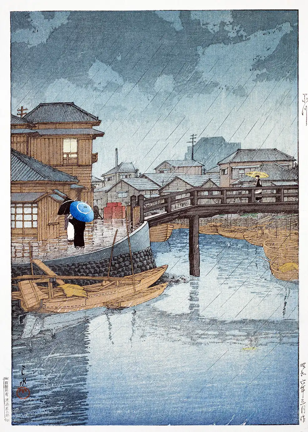 The composition is framed by the solid presence of a two-story wooden structure on the left, featuring detailed lattice windows and traditional tiled roofing. A simple wooden bridge crosses the canal, leading the eye toward a cluster of homes in the background. Small figures navigate the wet paths, adding a sense of scale and human presence to the scene. This Shinagawa Hasui Print utilizes a vertical orientation to emphasize the falling rain and the height of the traditional dwellings. The wooden boats, or temma-bune, are moored in a row, their curved prows reflecting the traditional maritime technology of the early 20th century. Every line in the architecture serves to ground the viewer in a specific historical moment.