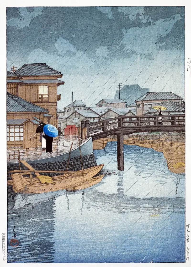 The artist utilized layers of pigment to create depth within the sky and water. The woodblock process requires meticulous carving for each color, ensuring that the rain effects appear integrated rather than overlaid. When viewing this Shinagawa Hasui Print, one notices the subtle gradation of the grey clouds, a technique known as bokashi. This method involves hand-applying ink to the block to create soft transitions, perfectly capturing the damp atmosphere of a Japanese spring. The deep indigo tones in the water contrast with the warm, golden hues of the boat wood, creating a balanced visual field that directs the viewer across the canal and toward the distant houses.