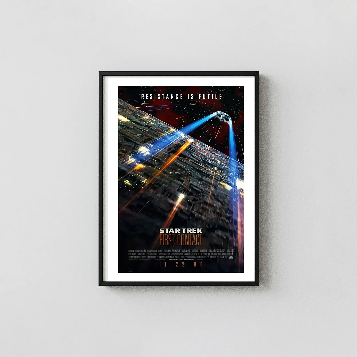 The electric blue-and-black palette pops hardest against white or very light grey walls where the contrast has room to work. A home theater, media room, or a dark-walled study are all ideal environments for this Star Trek First Contact 1996 movie poster. It reads confidently at every size, but the Enterprise-E detail rewards going large.