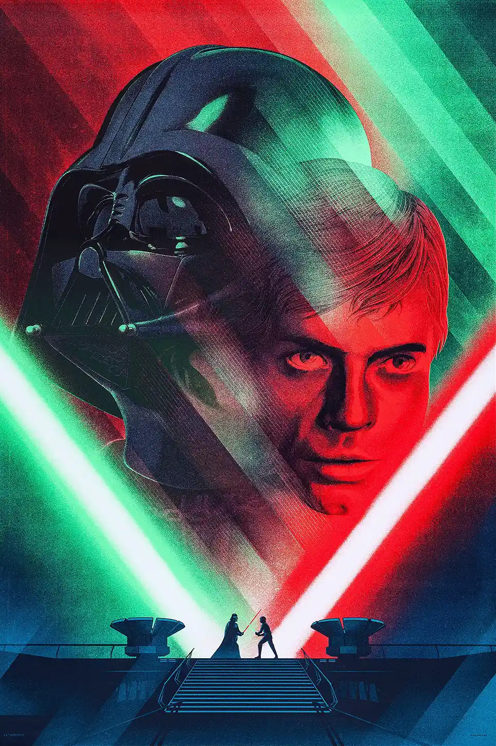 This screen-printed poster is a masterpiece of visual storytelling. The composition powerfully overlays the face of Luke Skywalker—lit dramatically in red, symbolizing his proximity to the dark side—with the looming shadow of Darth Vader’s helmet, bathed in green, hinting at the lingering good within. Below this psychological portrait, the iconic lightsaber duel on the Emperor’s throne room platform is rendered in stunning minimalist detail, emphasizing the stark contrast between the green (Jedi) and red (Sith) blades.