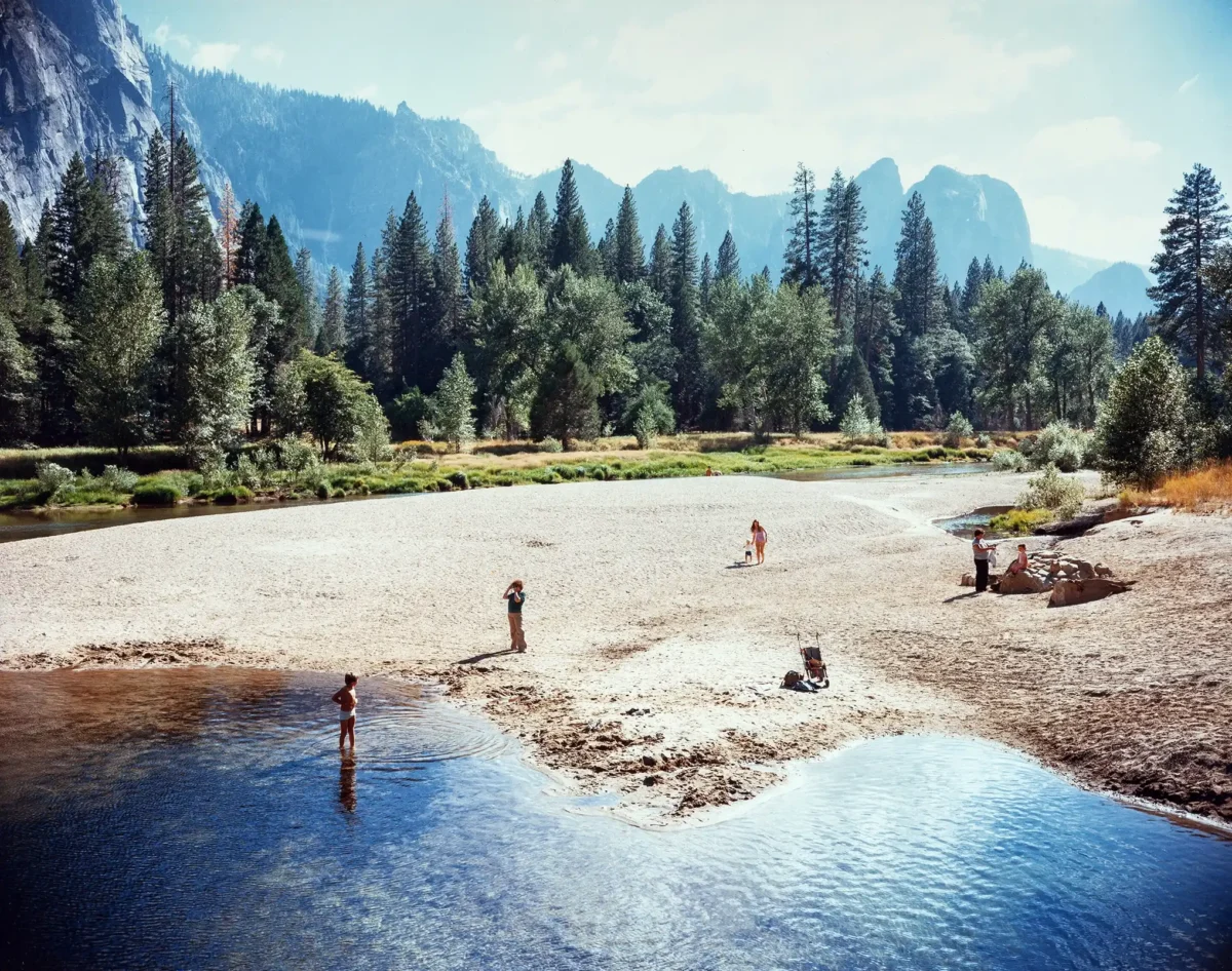 Capture the serene grandeur of the American landscape with this exceptional fine art poster by Stephen Shore. Taken in 1974 as part of his groundbreaking ‘Uncommon Places’ series, this photograph features a stunning view of the Yosemite Valley. It perfectly embodies Shore’s mastery of large-format color photography, presenting a deceptively casual yet perfectly composed scene of a vast sandy riverbank leading to the Merced River, framed by towering granite mountains and lush pine forests. This piece is ideal for those who appreciate the New Color movement and iconic 20th-century documentary style, bringing a sense of vast, quiet beauty to any space.