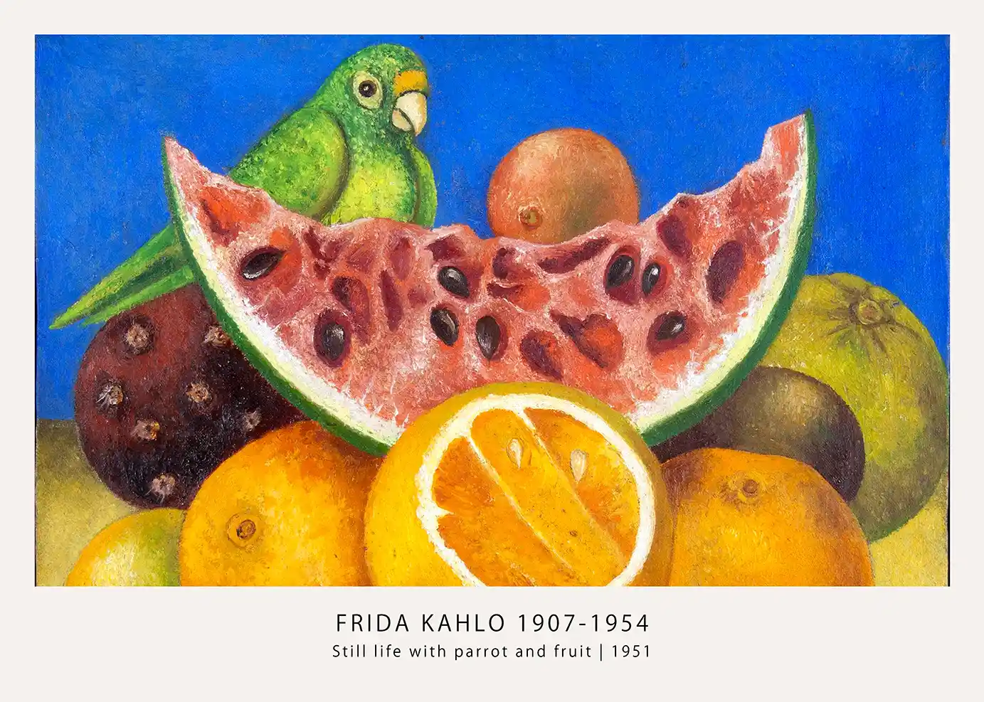 This frida kahlo still life parrot poster celebrates abundance in her vibrant 1951 kahlo fruit painting. The composition combines tropical fruit with a colorful parrot and Mexican flag. A joyful parrot and fruit print from her final creative period.