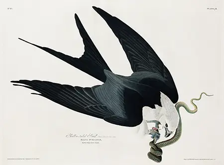 In this **Swallow-tailed Hawk print**, the subject is shown clutching a Garter Snake (Coluber saurita), illustrating the specialized diet and hunting prowess of the species. The snake’s winding form creates a secondary focal point, with its scales rendered in muted greens and yellows that provide a chromatic counterpoint to the monochromatic feathers of the hawk. The hawk’s head is turned back toward its prey, showing the hooked beak and the focused gaze characteristic of high-altitude hunters. The expansive wingspan dominates the frame, showcasing the aerodynamic efficiency that allows these birds to spend the majority of their lives in flight. By focusing on this dynamic interaction, Audubon moved beyond static profile views, favoring a more lifelike and dramatic portrayal of wildlife.
