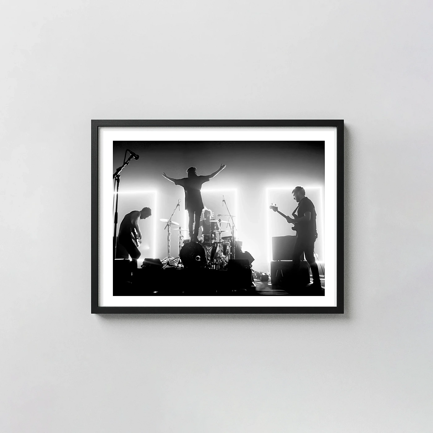 The monochrome palette of this The 1975 print is intentionally frictionless: it works against warm cream, terracotta, dark grey, deep blue, or exposed brick. A slim matte black frame is the obvious choice and also the correct one — it reinforces the graphic sensibility of the band’s visual identity without overcomplicating it. As bar cart art music print, it’s best at eye level on a mid-height shelf, ideally next to something that tells the same story from a different direction: a favourite record, a good bottle, a paperback you’ve read twice.