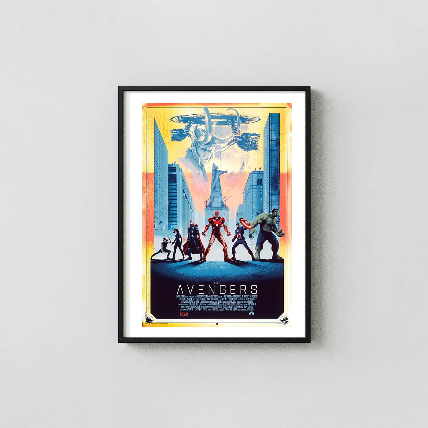 The print beautifully showcases the Earth’s Mightiest Heroes: Iron Man in his iconic Mark VII armor, Captain America wielding his shield, Thor ready with Mjolnir, the unstoppable Hulk, the precise aim of Hawkeye, and the tactical prowess of Black Widow. Towering above them, the striking visage of Loki, the God of Mischief, commands the chaotic, orange-hued sky alongside the menacing Chitauri fleet.