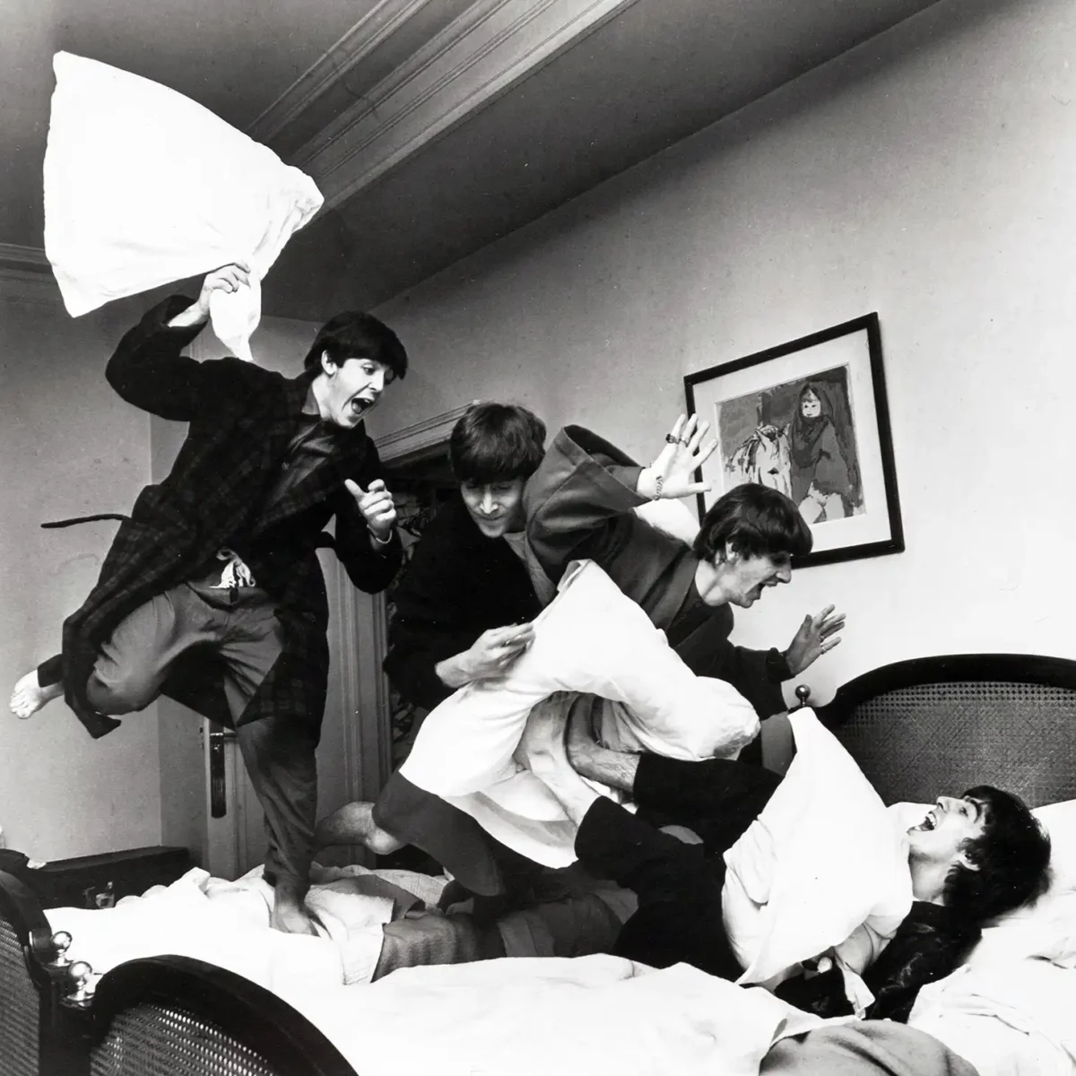 Capture the legendary energy of the Fab Four with this authentic The Beatles Pillow Fight poster. Taken by renowned photographer Harry Benson in 1964 at the George V Hotel, Paris, this iconic black and white photograph perfectly encapsulates the youthful joy and camaraderie of John, Paul, George, and Ringo right after hearing they hit number one in America. It’s more than just decor; it’s a piece of music history and a joyful moment frozen in time, making it essential wall art for any true fan.