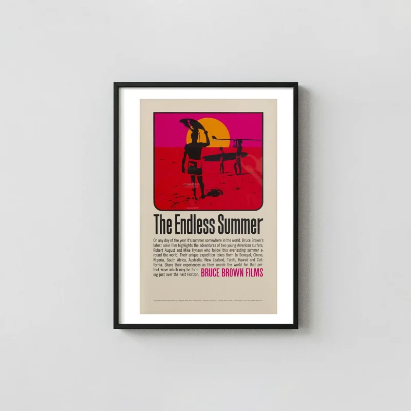 Celebrate the definitive surf documentary with this authentic reproduction of the original 1966 “The Endless Summer” movie poster. This iconic wall art captures the spirit of adventure and the timeless quest for the perfect wave. Featuring Bruce Brown’s classic visual style—bold black surfer silhouettes against vibrant, saturated fields of hot pink, red, and golden orange—this poster is a masterpiece of vintage 60s design. It’s more than just a print; it’s a piece of surfing history that instantly transports you to the beach.