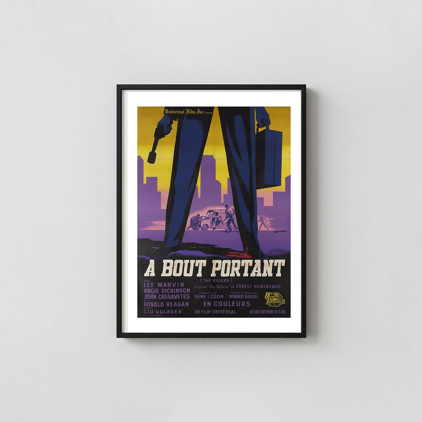 Capture the high-stakes drama of the 1964 crime classic, The Killers, with this stunning French release poster, titled “A Bout Portant.” Directed by Donald Siegel and starring Lee Marvin, Angie Dickinson, and Ronald Reagan (in his final acting role), this adaptation of Ernest Hemingway’s short story is a staple of the Neo-Noir genre. The iconic artwork, characteristic of designer Guy Gérard Noël, uses striking contrast and minimalism. It features an ominous, close-up view of the hitman’s legs, holding a silenced gun and a briefcase, with the violent heist scene dramatically framed between his stance. The bold use of purple, deep blue, and acidic yellow makes this a truly unique piece of cinematic wall art.