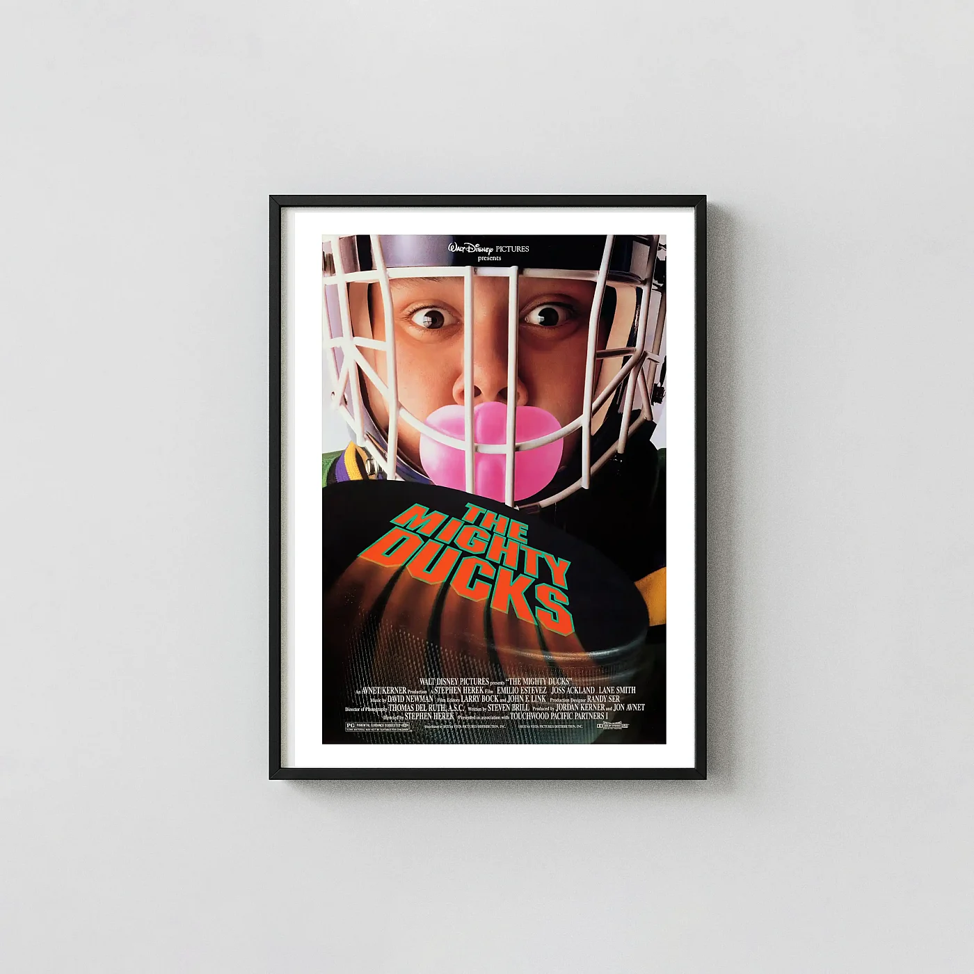 Relive the 90s sports classic with The Mighty Ducks movie poster. Featuring the iconic bubble gum helmet visual, this premium quality print is the perfect gift for fans. Order your wall art today!