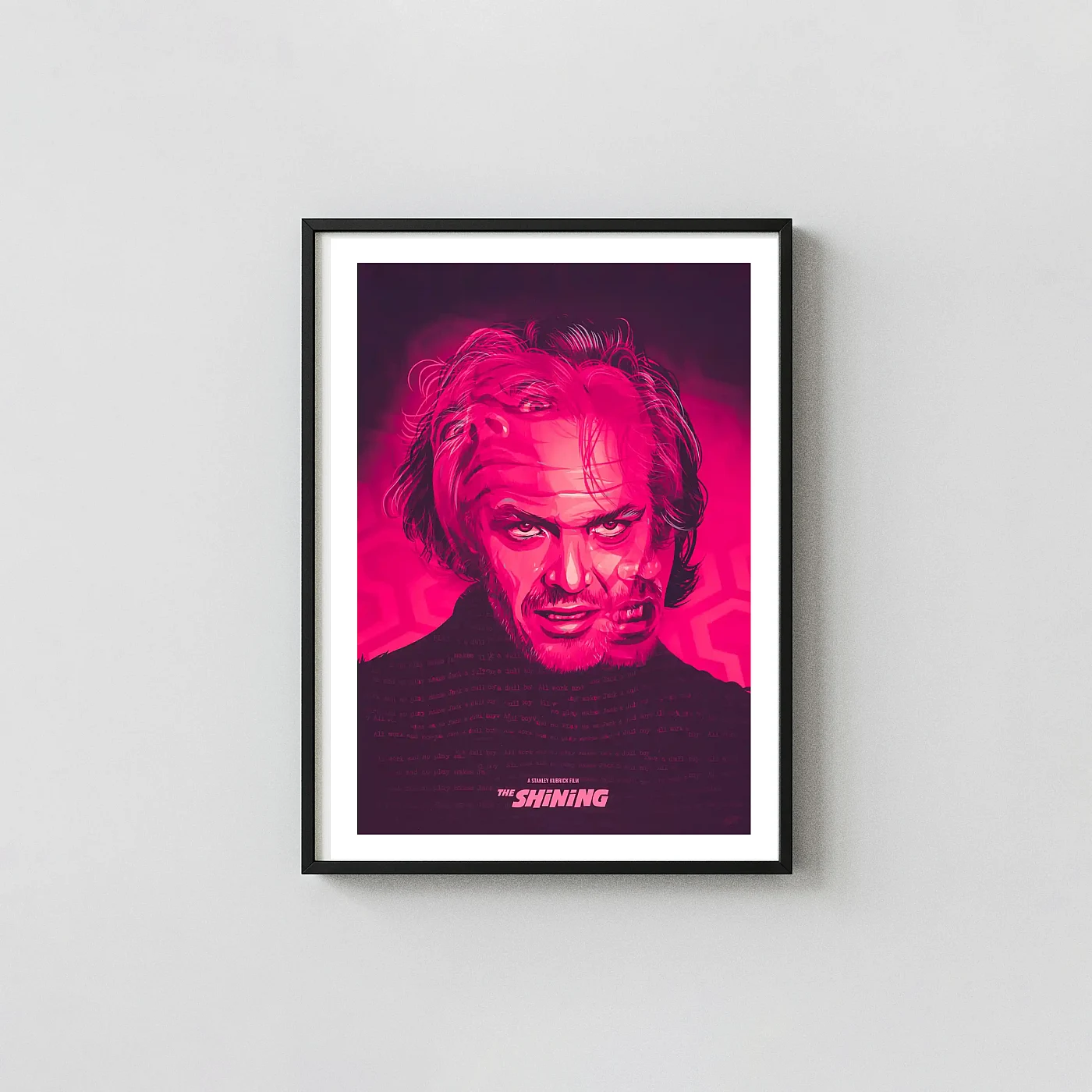 Capture the madness of the Overlook Hotel with this vivid magenta poster of Jack Torrance. A stunning, stylized tribute to Stanley Kubrick’s horror masterpiece, The Shining.