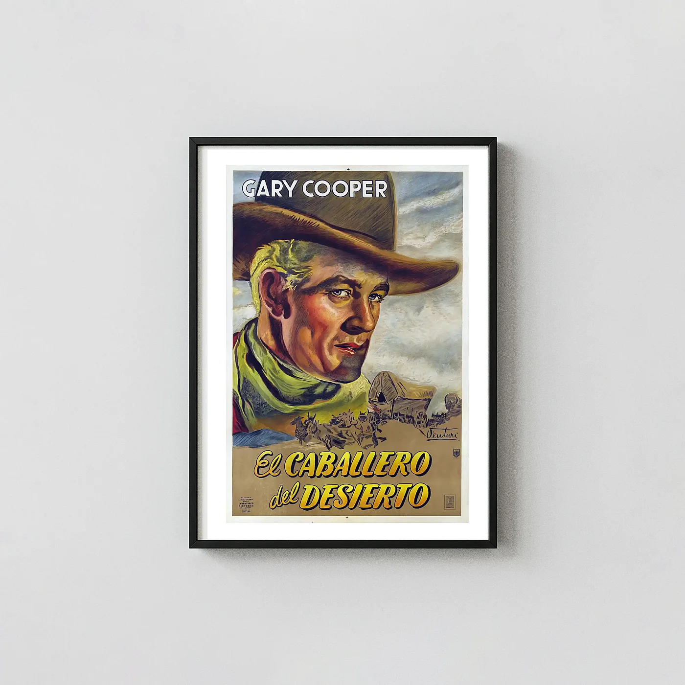 Celebrate the Golden Age of Hollywood with this stunning vintage poster art for the classic 1940 Western, The Westerner, starring the legendary Gary Cooper. This piece features the dynamic Argentine release title, El Caballero del Desierto (The Gentleman of the Desert). The artwork showcases a powerful, hand-painted close-up of Cooper as the heroic cowboy, Longfellow Deeds, set against a backdrop of covered wagons and the vast Western landscape. This dramatic illustration captures the intensity and rugged spirit that made this William Wyler film a timeless masterpiece of the genre, making it an essential piece of cinematic history wall art.