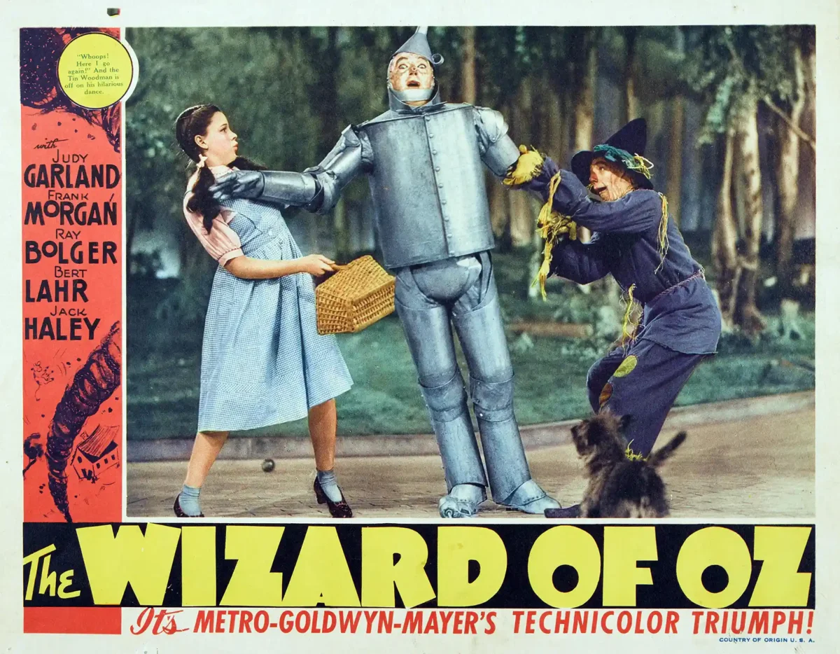 Step back into the magical land of Oz with this stunning vintage lobby card style poster. This iconic movie poster captures one of the most dynamic scenes featuring Dorothy, the Tin Man, and the Scarecrow, showcasing the groundbreaking Technicolor triumph of the 1939 Metro-Goldwyn-Mayer classic. This wall art print is a perfect way to celebrate one of the most beloved fantasy films ever made, bringing the vibrant adventure of the Yellow Brick Road right into your home.