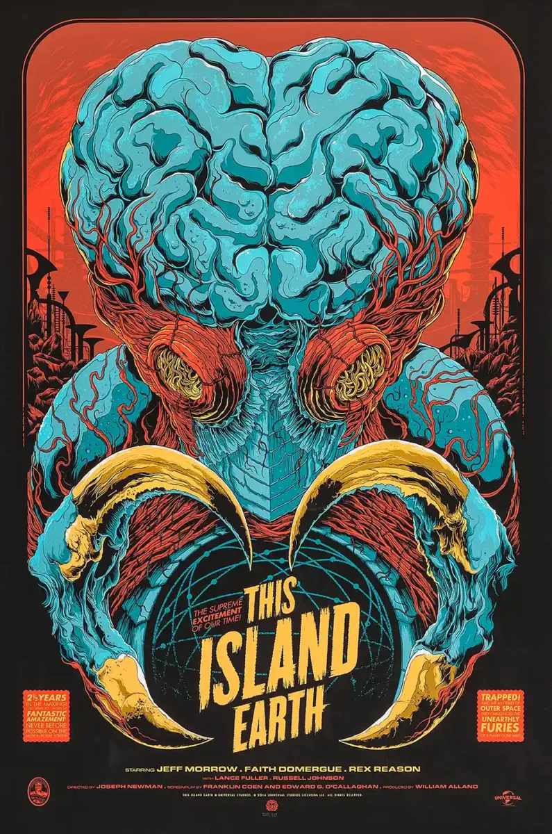 Own the terrifying Mondo artwork for the classic 1955 sci-fi film, This Island Earth. Features the massive brain creature, the Metaluna Mutant, in vibrant teal and red. Perfect vintage movie poster.