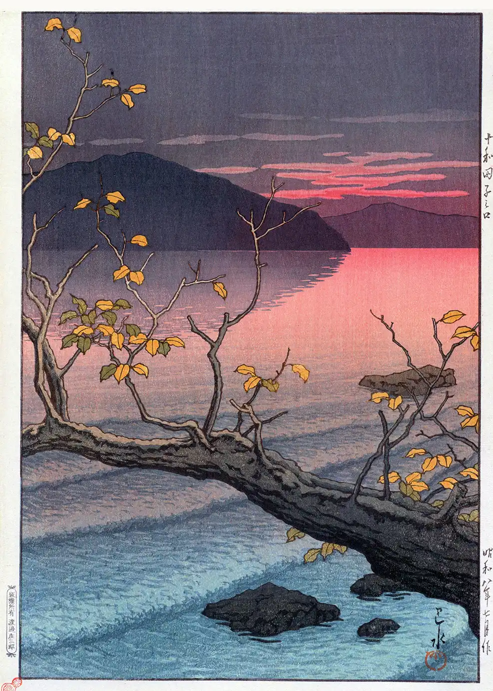 The year 1938 marked a significant period for the Shin-hanga movement in Japan. Artists during this era sought to maintain the integrity of the woodblock carving process while adopting more realistic approaches to lighting and shadow. The Towada Lake Print illustrates this shift by moving away from the flat color planes of earlier Ukiyo-e periods and toward a more painterly gradation known as bokashi. The carvers had to execute precise lines to define the gnarled bark of the foreground tree, while the printer applied pigments with horsehair brushes to achieve the soft magenta hues seen in the sky and their subsequent reflection in the lake.