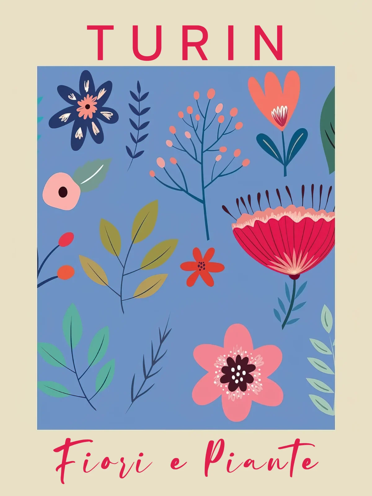 This vibrant poster, inspired by the Italian city of Turin, celebrates the lush beauty of “Fiori e Piante” (Flowers and Plants). It transforms traditional travel art into a bold, maximalist statement piece. The striking composition features stylized, folk-art flowers in reds, pinks, and olives against a brilliant periwinkle blue background, making it an instant centerpiece. This piece captures the joyful, natural spirit often associated with Northern Italian design and is ideal for anyone looking to infuse their space with color and vitality, offering a charming piece of Piedmontese wall decor.
