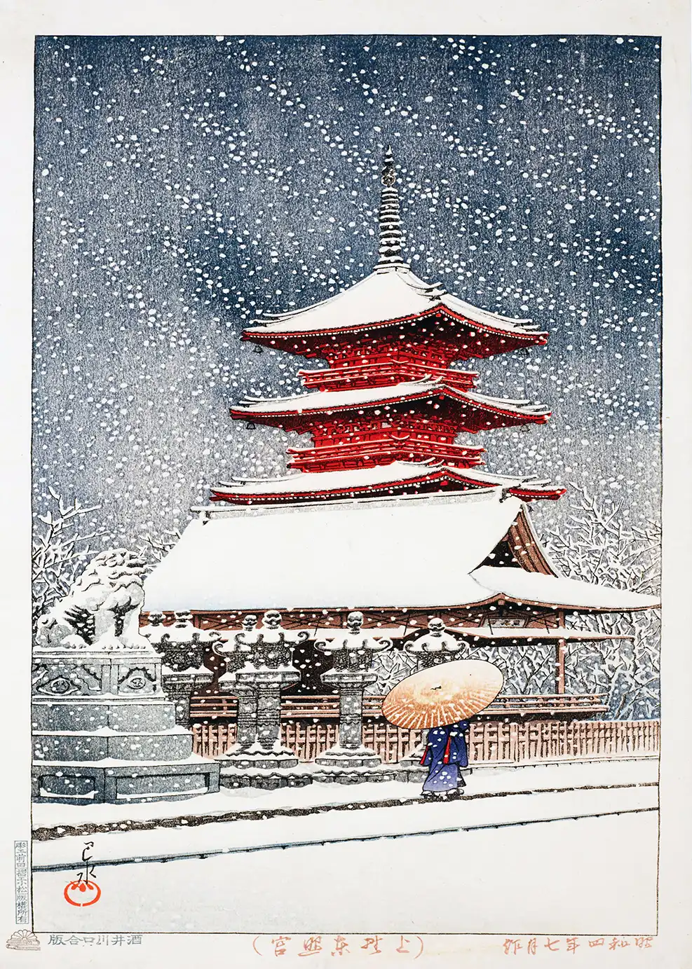 This Ueno Toshogu Shrine print captures a quiet moment of winter solitude in 1920s Tokyo. Originally created in 1929 by the renowned artist Hasui Kawase, this work is a premier example of the Shin-hanga movement. The scene portrays the five-story pagoda of the Ueno Toshogu Shrine shrouded in thick, falling snow. The artist utilized the gofun technique to represent individual snowflakes, creating a textured visual effect that makes the winter chill feel tactile and immediate. In the foreground, a figure carrying a traditional oiled-paper umbrella walks along a snow-covered path, providing a human element to the architectural grandeur. A stone komainu statue sits to the left, acting as a silent guardian of the sacred grounds.
