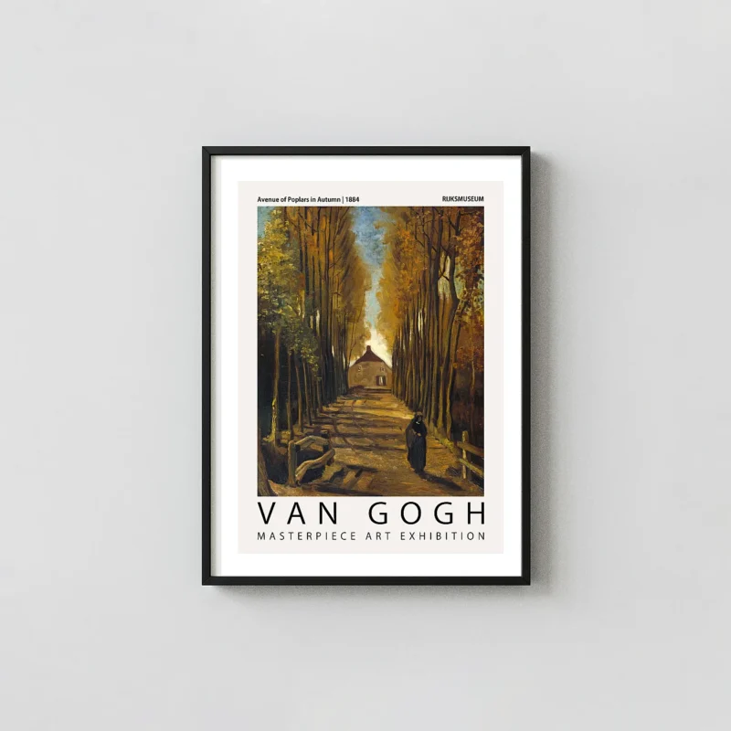 Integrating a Van Gogh autumn poster into your home decor provides an immediate connection to art history. The earthy tones of deep brown, ochre, and muted blues provide a versatile palette that complements both traditional and modern interior styles. Unlike his later high-contrast works, this piece relies on tonalism and subtle gradations of light. The way the sky peeks through the thinning canopy at the end of the avenue creates a natural focal point that draws the eye toward the distant cottage, making this Vincent van Gogh wall decor a perfect choice for rooms requiring a sense of depth and perspective.