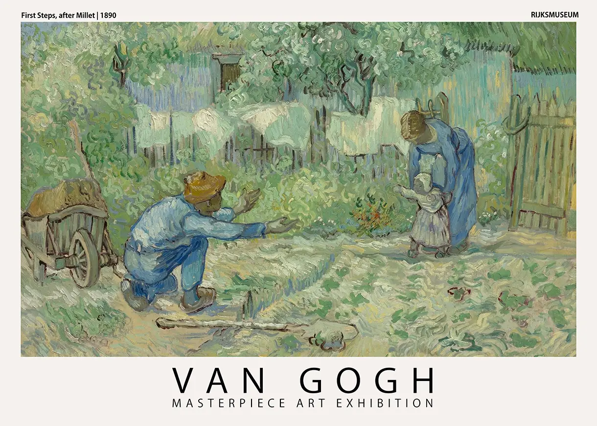 The Van Gogh First Steps print offers a window into the final year of the artist’s life, specifically his time in Saint-Rémy-de-Provence during 1890. This specific work is part of a series where the artist interpreted the themes of Jean-François Millet, a painter he deeply admired for his portrayal of peasant life. The image depicts a humble cottage garden where a father has set aside his tools to encourage his young child to walk toward him. It is a scene of profound domesticity and quiet emotion, rendered with the heavy, rhythmic brushwork that defines the post-impressionist era.