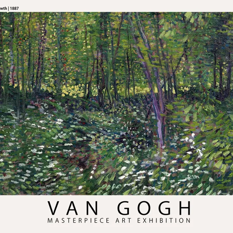 This Van Gogh forest print captures a pivotal moment in the artist’s career during his stay in Paris in 1887. Moving away from the dark, somber tones of his earlier Dutch period, the artist embraced the light and vibrant color theory of the French Impressionist movement. This specific work, often titled Trees and Undergrowth, focuses on a dense thicket of woodland life, specifically the forest floor covered in delicate white flowers. The composition lacks a traditional horizon line, pulling the viewer directly into the foliage and the rhythmic verticality of the saplings. This focus on the sous-bois or forest undergrowth was a recurring theme for the artist, allowing him to experiment with light and shadow in a confined, intimate space.