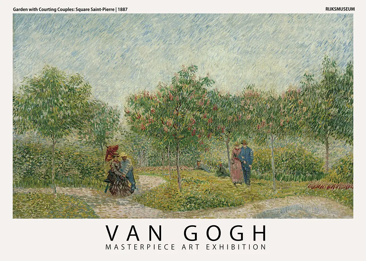 This Van Gogh garden print presents the lush greenery and social atmosphere of Square Saint-Pierre in Montmartre as captured by Vincent van Gogh in 1887. During his residency in Paris, the artist moved away from the somber tones of his Dutch period and began experimenting with the vibrant palettes of the Impressionists and the structured techniques of the Neo-Impressionists. This specific work, often referred to as Garden with Courting Couples, reflects a pivotal moment in his career where he adopted a stippled, pointillist approach to depict light and texture.