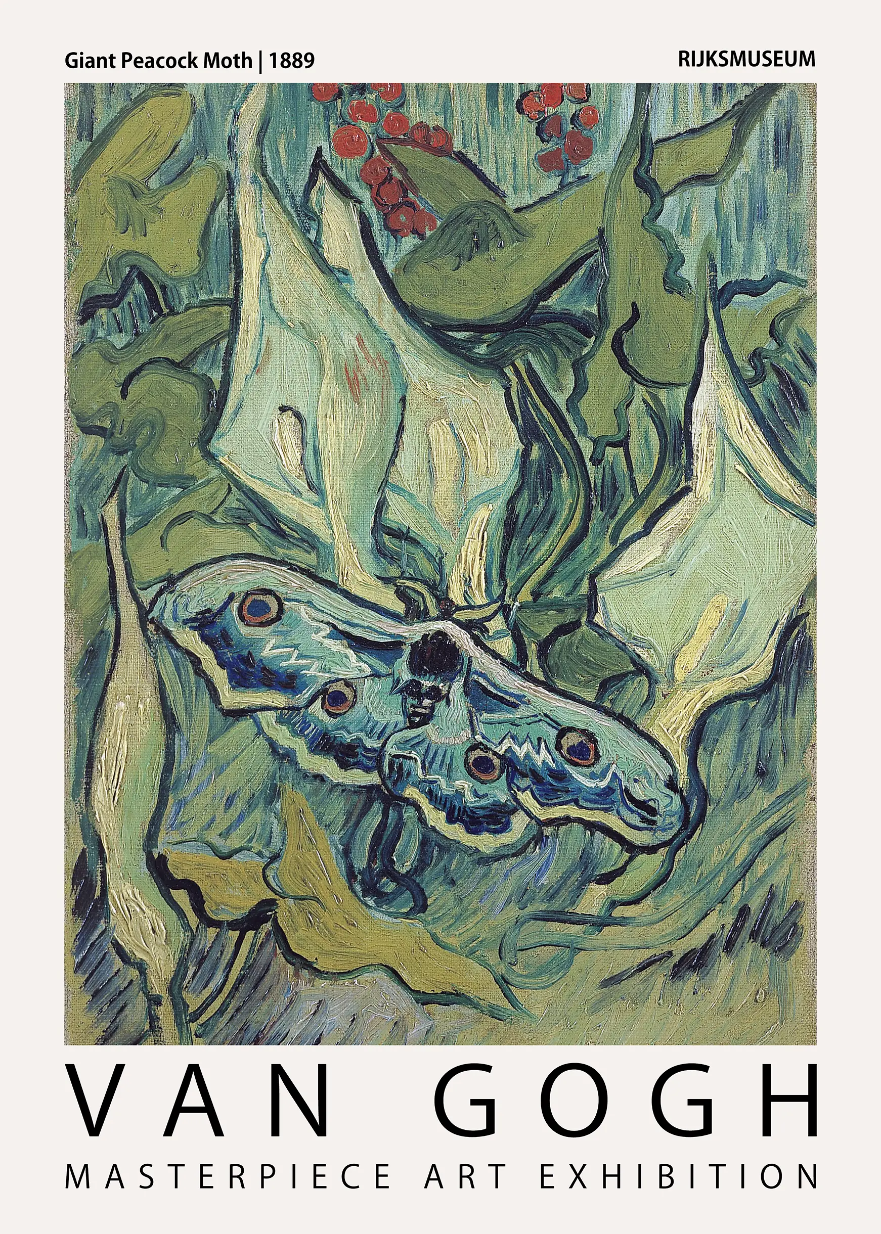 The Van Gogh moth print exemplifies the artist’s mastery of tonal contrast and organic geometry. The central figure of the moth is rendered in muted blues and greys, with circular “eye” patterns on the wings that draw the viewer inward. These cool tones are juxtaposed against a background of swirling, deep green foliage and clusters of small red berries. The use of dark outlines around the leaves and the moth provides a graphic quality that anticipates modern poster design. The brushstrokes are thick and directional, following the curves of the leaves and the anatomy of the insect to create a sense of movement and depth.