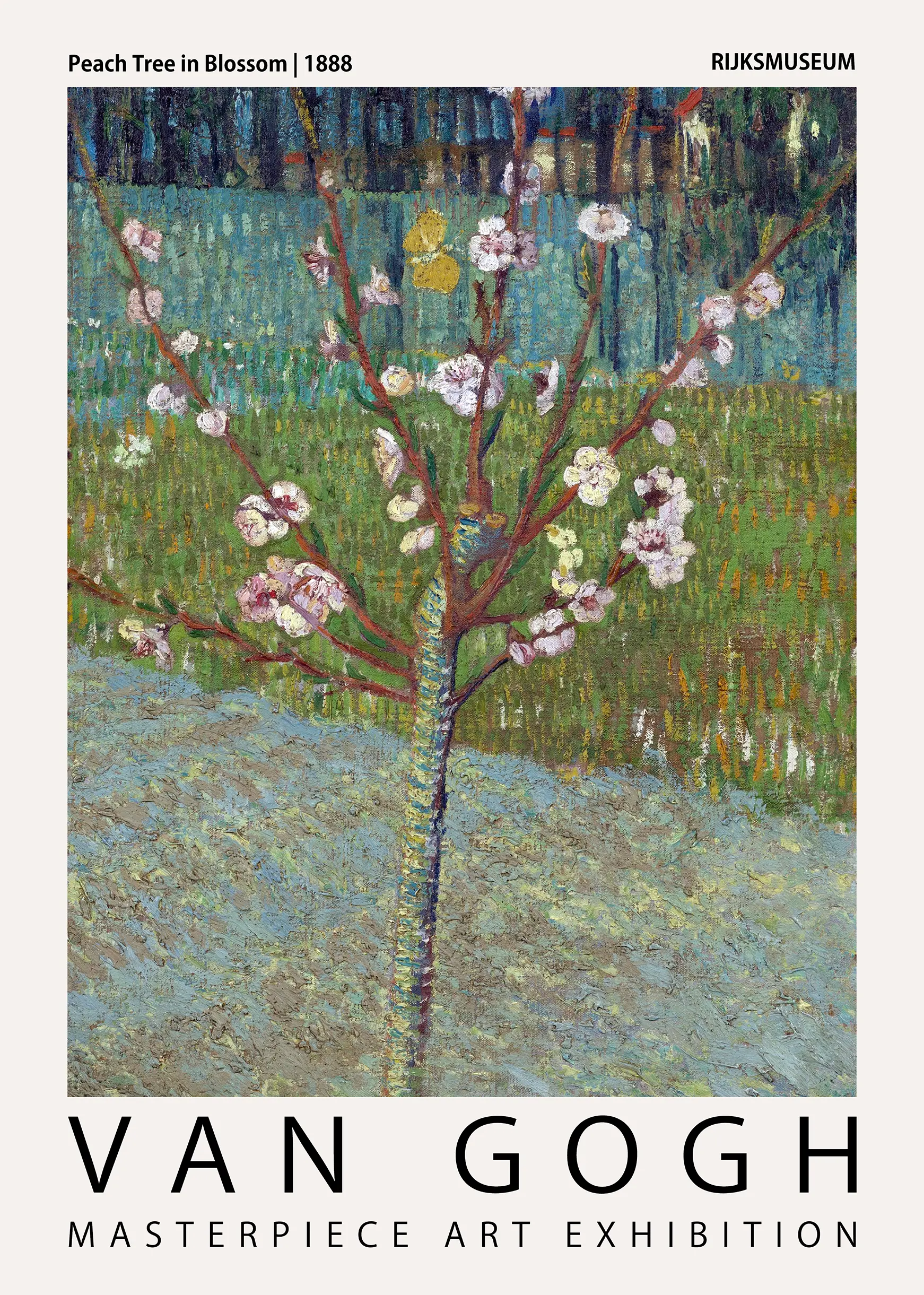 This Van Gogh Peach Tree print captures the vibrant energy of Arles in the spring of 1888. During this highly productive period, the artist moved to the South of France, seeking the clear light and vivid colors that would define his most famous works. This specific composition focuses on a young peach tree, its branches heavy with delicate pink blossoms, standing as a symbol of rebirth and the fleeting nature of spring. The original work is a testament to the influence of Japanese woodblock prints on his style, visible in the bold outlines and the flattened perspective of the background. By choosing this vintage exhibition poster, you bring a piece of art history into your home that maintains the aesthetic integrity of the 19th-century original while fitting into a modern interior design scheme.