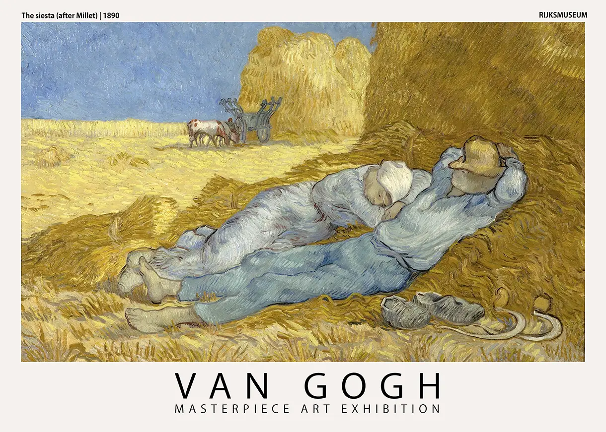 Acquiring a **Van Gogh Siesta poster** allows for the integration of historical significance into a domestic environment. The composition serves as a reminder of the cycle of labor and rest, a theme that remained central to Van Gogh’s artistic philosophy. Because this print utilizes high-resolution source files, the minute details of the woven hay and the fabric of the peasant clothes are preserved with absolute clarity. It is a vital addition for collectors of post-impressionist wall art who value historical accuracy and high-fidelity production.