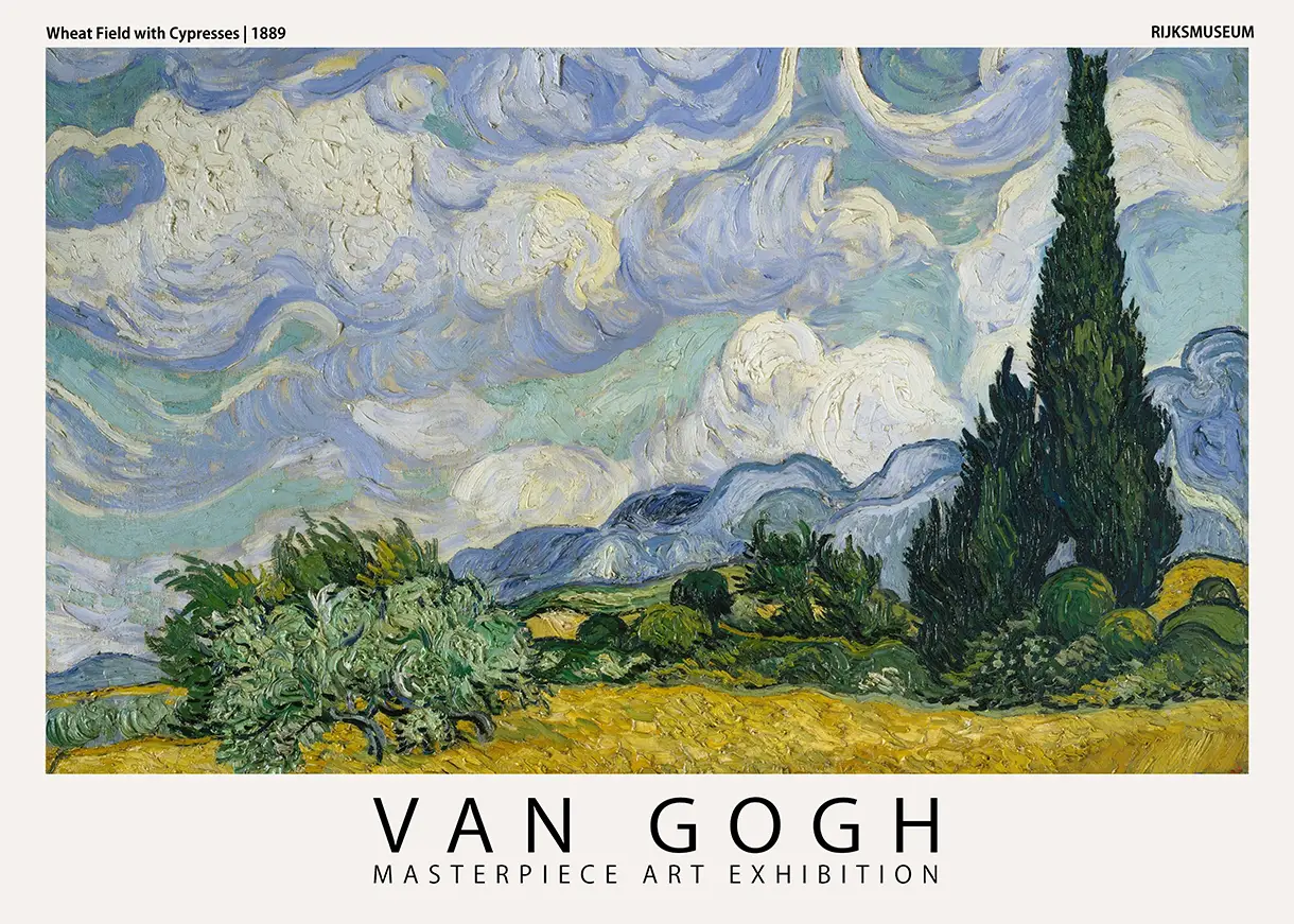 In the summer of 1889, Vincent van Gogh looked through the iron-barred window of his studio and found inspiration in the swaying flora of the French countryside. This Van Gogh wheat field print represents one of three versions of this specific composition, characterized by its heavy impasto and emotional intensity. The tall, dark green cypress trees act as a visual anchor against the turbulent, rhythmic clouds. These trees, which Van Gogh famously compared to Egyptian obelisks, provide a vertical contrast to the horizontal expanse of the ripening wheat. By displaying this Van Gogh wheat field print, you are showcasing a pivotal moment in art history where nature and psychological state merged into a single vision.