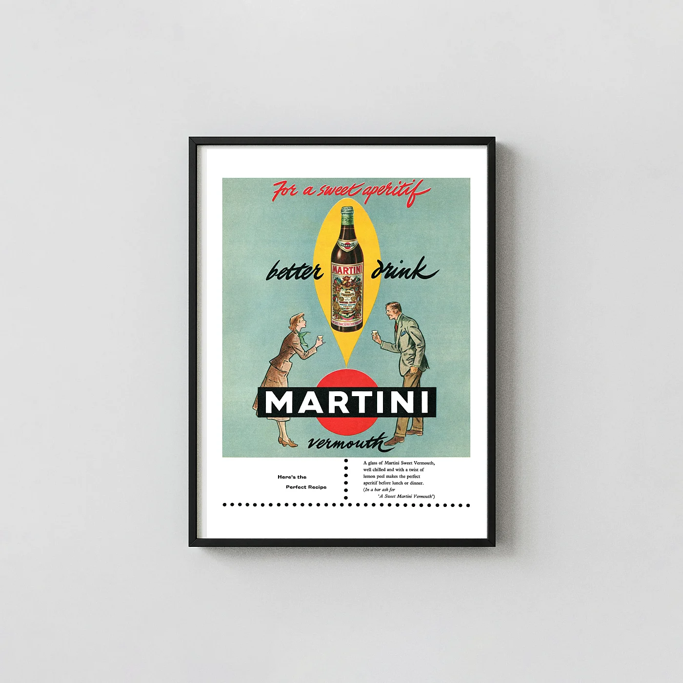 - Old-school advertising character: Vintage Martini Vermouth Poster 'For a Sweet Aperitif' Retro Cocktail Ad has that retro commercial-poster feel that works especially well around bars, kitchens, lounges, and studios.